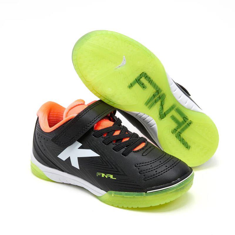 Nuevo diseño para las zapatillas de fútbol sala para niños en color negro, Final Indoor Elastic, las zapatillas perfectas para sus primeras aventuras en el fútbol sala.